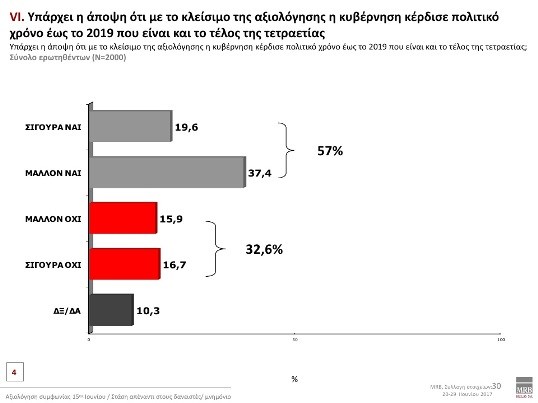 Το 57% εκτιμά ότι με το κλείσιμο της αξιολόγησης η κυβέρνηση κέρδισε πολιτικό χρόνο έως το 2019 που είναι και το τέλος της τετραετίας.