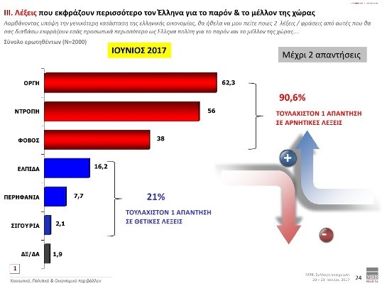 Η λέξη «οργή» εκφράζει σε ποσοστό 62,3% περισσότερο τους πολίτες για το παρόν και το μέλλον της χώρας και ακολουθεί η λέξη «ντροπή» με ποσοστό 56%.