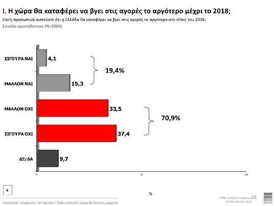 Στο ερώτημα αν η χώρα θα καταφέρει να βγει στις αγορές το αργότερο μέχρι το 2018, το 70,9% απαντά Σίγουρα Όχι-Μάλλον Όχι.