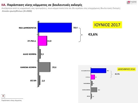 Εξαιρετικό ενδιαφέρον παρουσιάζουν οι τάσεις της MRB. Η συγκεκριμένη μέτρηση αποτελείται από την πανελλαδική έρευνα σε 2.000 πολίτες με δικαίωμα ψήφου με τη μέθοδο των προσωπικών συνεντεύξεων (face to face) και καταγράφει τη σημερινή πολιτική κατάσταση της χώρας (χρόνος διεξαγωγής 20 έως 29 Ιουνίου 2017).