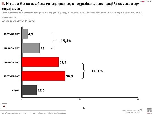 Το 68,1% απαντά Σίγουρα Όχι-Μάλλον Όχι στο ερώτημα αν πιστεύει ότι η χώρα θα καταφέρει να τηρήσει στις υποχρεώσεις που προβλέπονται στη συμφωνία αναφορικά με τα πρωτογενή πλεονάσματα.