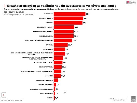 Εξαιρετικό ενδιαφέρον παρουσιάζουν οι απαντήσεις των πολιτών στο ερώτημα σε ποια προσωπικά-οικογενειακά έξοδα θα αναγκαστούν να κάνουν περικοπές μέσα στο επόμενο 12μηνο. Ενδεικτικά, σχεδόν 1 στους 3 θα κάνει περικοπές στις αγορές του από το σούπερ μάρκετ και ένας στους 5 από τρόφιμα.