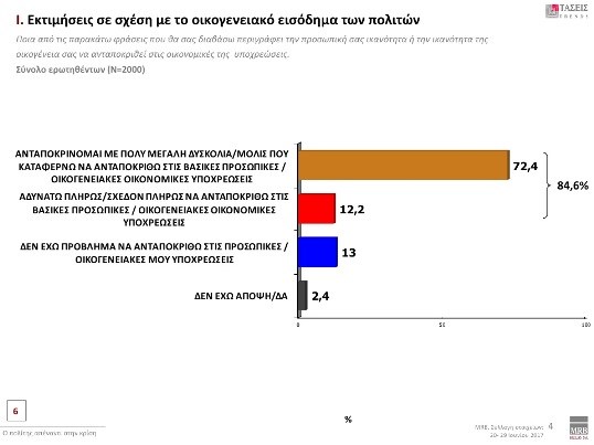 Στις εκτιμήσεις σε σχέση με το οικογενειακό εισόδημα οι πολίτες σε ποσοστό 72,4% απαντούν ότι ανταποκρίνονται με πολύ μεγάλη δυσκολία ή μόλις που καταφέρνουν να ανταποκριθούν στις βασικές-προσωπικές-οικογενειακές οικονομικές υποχρεώσεις. Ενώ ποσοστό 12,2% δηλώνει ότι αδυνατεί πλήρως ή σχεδόν πλήρως να ανταποκριθεί στις βασικές-προσωπικές-οικογενειακές οικονομικές υποχρεώσεις.