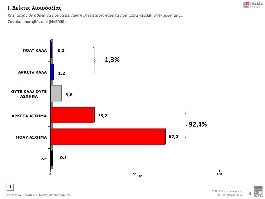 Σε ό,τι αφορά τους δείκτες αισιοδοξίας και συγκεκριμένα στο ερώτημα πως πιστεύετε ότι πάνε τα πράγματα γενικά στη χώρα μας, το 92,4% απαντά Πολύ Άσχημα-Αρκετά Άσχημα.