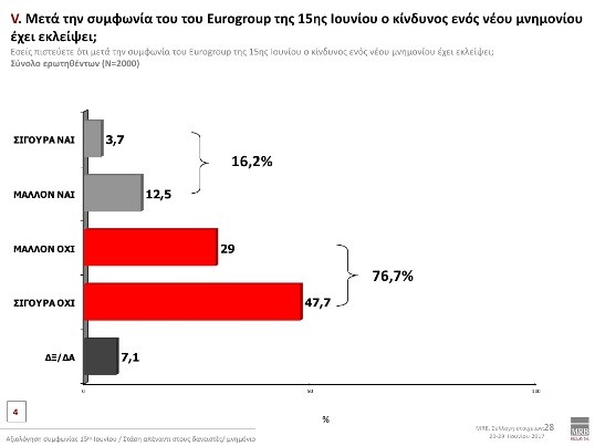 Στο ερώτημα εάν πιστεύουν ότι μετά τη συμφωνία στο Eurogroup της 15ης Ιουνίου ο κίνδυνος ενός νέου μνημονίου έχει εκλείψει, το 76,7% απαντά Μάλλον Όχι-Σίγουρα Όχι.
