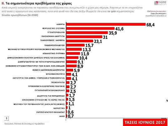 Οι πολίτες θεωρούν ότι τα τρία σημαντικότερα προβλήματα της χώρας είναι: η ανεργία (68,4%), το φορολογικό σύστημα (41,6%) και η υγεία-περίθαλψη (35,9%).