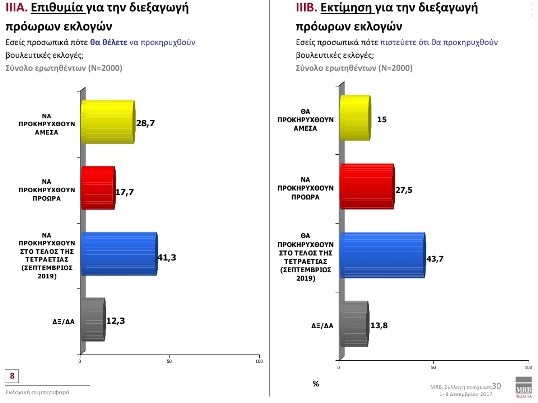 Στο ερώτημα πότε θα θέλετε να προκηρυχθούν βουλευτικές εκλογές, το 28,7% απαντά να προκηρυχθούν άμεσα, πρόωρα το 17,7% και το 41,3%, στο τέλος της τετραετίας, ενώ στο ερώτημα πότε πιστεύετε ότι θα προκηρυχθούν βουλευτικές εκλογές, το 15% απαντά άμεσα, το 27,5% πρόωρα και το 43,7% στο τέλος της τετραετίας.
