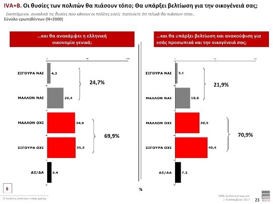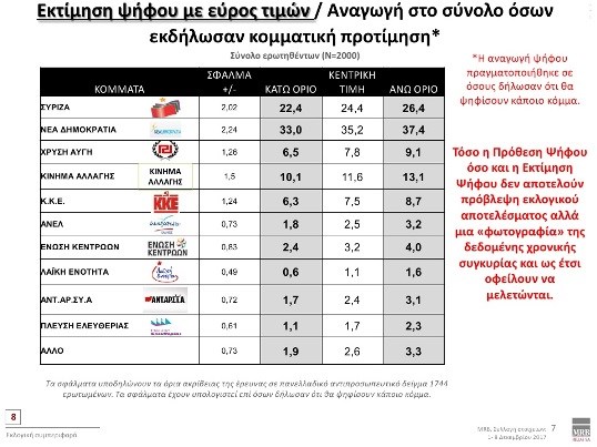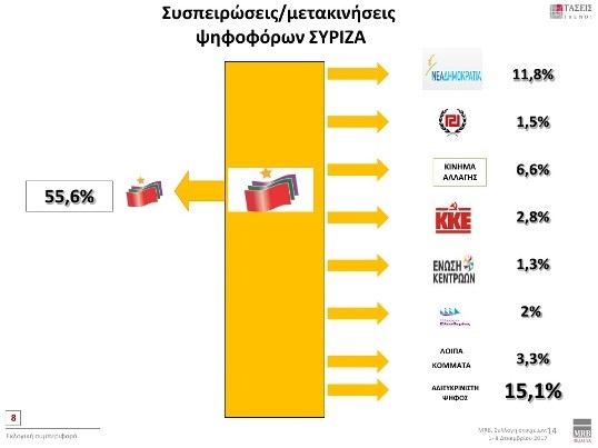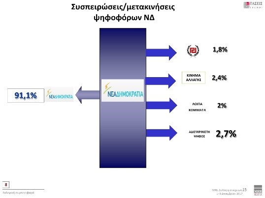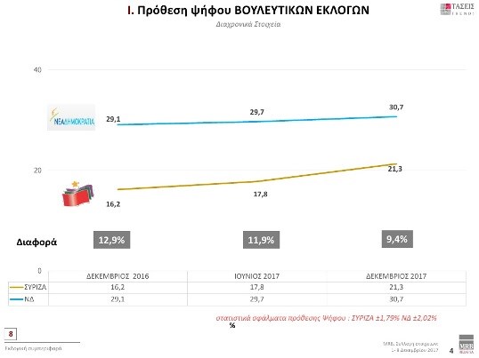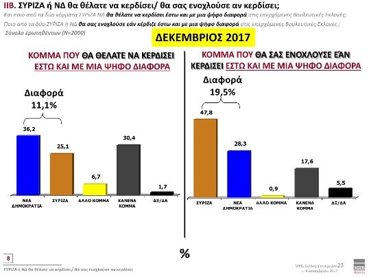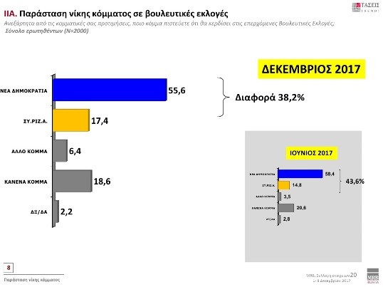 Εξαιρετικό ενδιαφέρον παρουσιάζουν οι τάσεις της MRB. Η συγκεκριμένη μέτρηση αποτελείται από την πανελλαδική έρευνα σε 2.000 πολίτες με δικαίωμα ψήφου, με τη μέθοδο των προσωπικών συνεντεύξεων (face to face) και καταγράφει τη σημερινή πολιτική κατάσταση της χώρας (χρόνος διεξαγωγής 1 έως 8 Δεκεμβρίου 2017).
