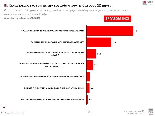 Στις εκτιμήσεις σε σχέση με την εργασία στους επόμενους 12 μήνες και στο ερώτημα ποια από τις παρακάτω φράσεις σας εκφράζει περισσότερο όσον αφορά τη σχέση σας με τη δουλειά σας, το 49% των πολιτών απαντά ότι «θα διατηρήσω τη δουλειά μου, αλλά με μικρότερες απολαβές».