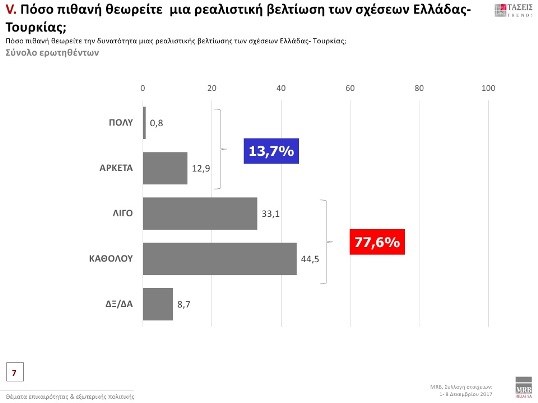 Εξαιρετικό ενδιαφέρον παρουσιάζουν οι απαντήσεις των πολιτών στο ερώτημα «Πόσο πιθανή θεωρείται μια ρεαλιστική βελτίωση των σχέσεων Ελλάδας – Τουρκίας;», με αφορμή και την πρόσφατη επίσκεψη Ερντογάν στην Αθήνα.