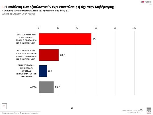 Στο ερώτημα «η υπόθεση των εξοπλιστικών έχει επιπτώσεις ή όχι στην κυβέρνηση;» το 55% απαντά πως «έχει σοβαρή βάση και αποτελεί σοβαρό πρόβλημα για την κυβέρνηση», ενώ το 20,8% δηλώνει ότι «έχει κάποια βάση, αλλά δεν αποτελεί σοβαρό πρόβλημα για την κυβέρνηση».
