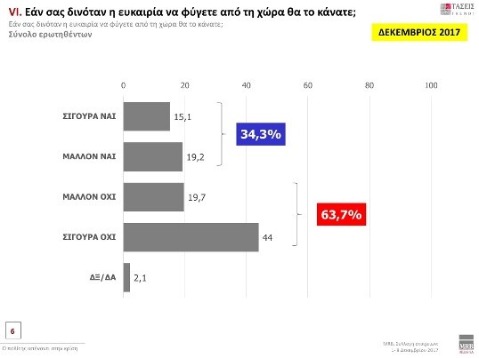 Το 63,7% απαντά «Σίγουρα όχι-Μάλλον όχι» στο ερώτημα «αν σας δινόταν η ευκαιρία να φύγετε από τη χώρα θα το κάνατε;». Οι θετικές απαντήσεις αγγίζουν το 34,3%.
