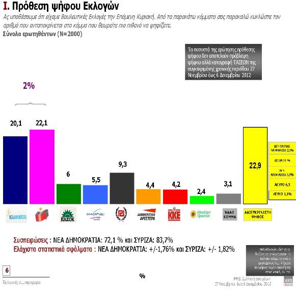 Στην πρόθεση ψήφου σύμφωνα με τις εξαμηνιαίες τάσεις της MRB ο ΣΥΡΙΖΑ προηγείται με ποσοστό 22,1%, ενώ η Νέα Δημοκρατία συγκεντρώνει ποσοστό 20,1%. Τρίτο κόμμα αναδεικνύεται η Χρυσή Αυγή με 9,3% και ακολουθούν: ΠΑΣΟΚ (6%), Ανεξάρτητοι Ελληνες (5,5%), Δημοκρατική Αριστερά (4,4%), ΚΚΕ (4,2%) και Οικολόγοι Πράσινοι (2,4%). Αλλο κόμμα απαντά το 3,1%, Λευκό το 1,1%, Άκυρο το 6,3%, ενώ αδιευκρίνιστη είναι η ψήφος για το 22,9% των ερωτηθέντων.