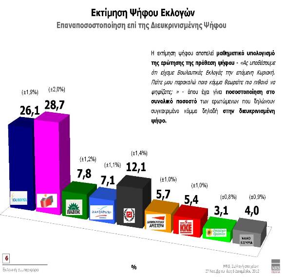 Στην εκτίμηση ψήφου, ο ΣΥΡΙΖΑ διευρύνει τη διαφορά και προηγείται με ποσοστό 28,7%, ακολουθούν η Νέα Δημοκρατία με 26,1%, η Χρυσή Αυγή με 12,1%, το ΠΑΣΟΚ με 7,8%, οι Ανεξάρτητοι Ελληνες με 7,1%, η Δημοκρατική Αριστερά 5,7%, το ΚΚΕ 5,4%, οι Οικολόγοι Πράσινοι με 3,1% και Άλλο Κόμμα 4%.