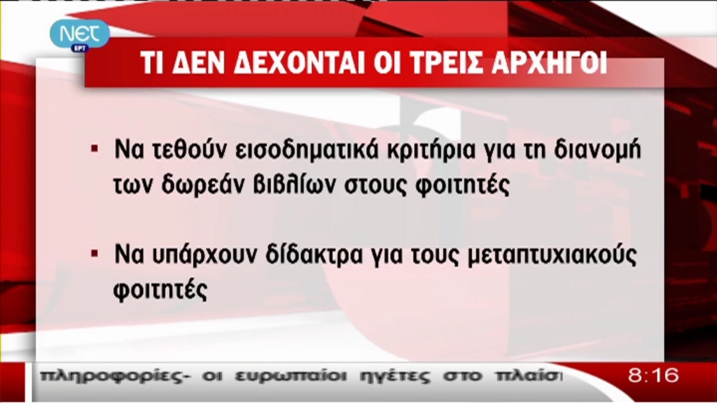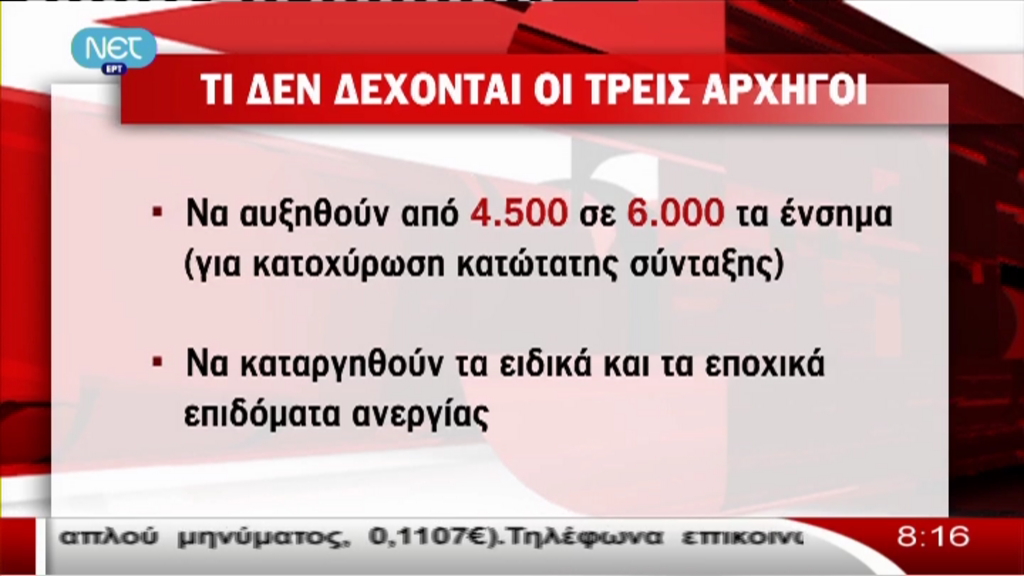 Τι δεν δέχονται οι τρεις αρχηγοί Enikos Newsroom 08:24, Πέμπτη 18 Οκτωβρίου 2012 πολιτική Κάποιες, ελάχιστες είναι η αλήθεια, από τις απαιτήσεις της τρόικας, που απορρίπτουν οι τρεις αρχηγοί. ΜΕΤΡΑ ΤΡΟΙΚΑ Μοιράσου το: σχολίασε κι εσύ (0 σχόλια) Ακολουθήστε το enikos.gr στο Google News και μάθετε πρώτοι όλες τις ειδήσεις Δείτε όλες τις τελευταίες ειδήσεις από την Ελλάδα και τον Κόσμο στο enikos.gr Ειδήσεις Ροή Ειδήσεων 3 ώρες πριν Κυψέλη: Για πρώτη ημέρα βρισκόταν στο σχολείο η 16χρονη που επιτέθηκε με μαχαίρι στην 14χρονη – Τι αναφέρουν μαρτυρίες μαθητών για το επεισόδιο 1 ώρα πριν Ρομπ και Μισέλ Ράινερ: Συνελήφθη ο γιος τους ως ύποπτος για την δολοφονία τους 1 ώρα πριν Κρήτη: Εντοπίστηκε στίγμα του 33χρονου γιατρού που έχει εξαφανιστεί μέσω νέας τεχνολογίας που εφαρμόζεται για πρώτη φορά στην Ελλάδα 4 ώρες πριν Κύκλωμα στη Χαλκιδική: Ακόμη 26 αστυνομικοί και 54 ιδιώτες στη δικογραφία – Διαπιστώθηκαν 95 περιπτώσεις δωροληψίας – δωροδοκίας 4 ώρες πριν Τσιάρας: Καλούμε άμεσα τους εκπροσώπους των αγροτών σε ουσιαστικό διάλογο – Υπάρχουν περιθώρια, η κοινωνία περιμένει υπευθυνότητα 3 ώρες πριν Τα 3 ζώδια που θα έχουν τύχη «βουνό» έως τις 21 Δεκεμβρίου – «Η ανατροπή που περιμένετε πλησιάζει» 7 ώρες πριν Μακροζωία: 55χρονος που ισχυρίζεται ότι βιολογικά είναι 20 ετών μοιράζεται μια απλή συμβουλή για υγιή εγκέφαλο 8 ώρες πριν Οι 8 φράσεις που δίνουν αμέσως την εντύπωση πως είστε δύσκολος άνθρωπος 10 ώρες πριν Κληρονόμησε 2,8 εκατ. ευρώ και φοβάται ότι οι άνδρες θα την πλησιάζουν για τα λεφτά – «Μήπως καλύτερα να το κρατήσω μυστικό;» 4 λεπτά πριν Μητσοτάκης: Αύριο το απόγευμα η ομιλία του στη Βουλή για τον προϋπολογισμό 14 λεπτά πριν Λευκάδα: Αγοράκι 2 ετών έπεσε σε σηπτική δεξαμενή – Βίντεο από την επιχείρηση πυροσβεστών για την διάσωσή του 19 λεπτά πριν Γάμος: Αν ένας άνδρας νιώθει βαθιά μοναξιά, θα αρχίσει να κάνει αυτά τα 11 πράγματα μέσα στο σπίτι 24 λεπτά πριν Κωνσταντίνος Βασάλος: Η απάντηση για την προσωπική του ζωή – «Γι’ αυτό την κρατάω κρυφή…» 28 λεπτά πριν Βαρύ πένθος για τον Βαγγέλη Μαρινάκη – Πέθανε η μητέρα του ENIKOS NETWORK Μάριος Θεμιστοκλέους: Το ΕΣΥ ενισχύεται, εκσυγχρονίζεται, αλλάζει Στο νοσοκομείο 15χρονη μαθήτρια μετά από μαχαίρωμα μέσα σε γυμνάσιο της Αθήνας Υγειονομικοί: Ανανεώνονται οι συμβάσεις εργαζομένων άνω των 55 ετών στο ΕΣΥ – Τα 2 νέα προγράμματα στη ΔΥΠΑ Κεραμέως στη Βουλή: Στόχος για το 2026 η αύξηση μισθών και η μείωση ανεργίας κάτω από το 8% Σύγχρονος Νοστράδαμος: Προειδοποιεί για «μεγάλο γεγονός» τους επόμενους μήνες που θα συγκλονίσει τη Βρετανία και τον κόσμο Τεστ παρατηρητικότητας: Μπορείτε να βρείτε τις 3 διαφορές στις εικόνες με έναν πιγκουίνο σε 14 δευτερόλεπτα περισσότερα 19:15 , Δευτέρα 15 Δεκεμβρίου 2025 Μητσοτάκης: Αύριο το απόγευμα η ομιλία του στη Βουλή για τον προϋπολογισμό Ο πρωθυπουργός Κυριάκος Μητσοτάκης θα μιλήσει στη Βουλή, στη συζήτηση για την κύρωση του Κρατι... 16:58 , Δευτέρα 15 Δεκεμβρίου 2025 Νίκος Δένδιας: Ανακριβές ότι πήραμε πίσω την πρότασή μας για το SAFE – ΒΙΝΤΕΟ «Είναι ανακριβές ότι πήραμε πίσω την πρόταση μας για τη συμμετοχή μας στο ευρωπαϊκό χρηματοδοτ... 16:47 , Δευτέρα 15 Δεκεμβρίου 2025 Κεραμέως: Τα κόμματα θα κληθούν σύντομα να πάρουν θέση για την ιστορική συμφωνία με τους κοινωνικούς εταίρους – «Πυρά» από την αντιπολίτευση Η κυβέρνηση καταθέτει την ιστορική κοινωνική συμφωνία με όλους τους εθνικούς κοινωνικούς εταίρ... 15:47 , Δευτέρα 15 Δεκε
