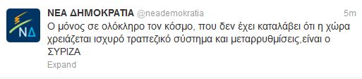 “Τιτίβισμα” αναρτήθηκε πριν από λίγο στο προφίλ της Νέας Δημοκρατίας στο Twitter, με… στόχο τον ΣΥΡΙΖΑ. Iδού: