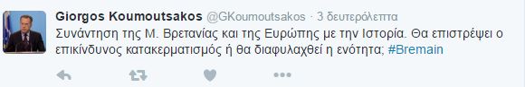 «Συνάντηση της Μεγάλης Βρετανίας και της Ευρώπης με την Ιστορία. Θα επιστρέψει ο επικίνδυνος κατακερματισμός ή θα διαφυλαχθεί η ενότητα; #Bremain», έγραψε ο Γιώργος Κουμουτσάκος.