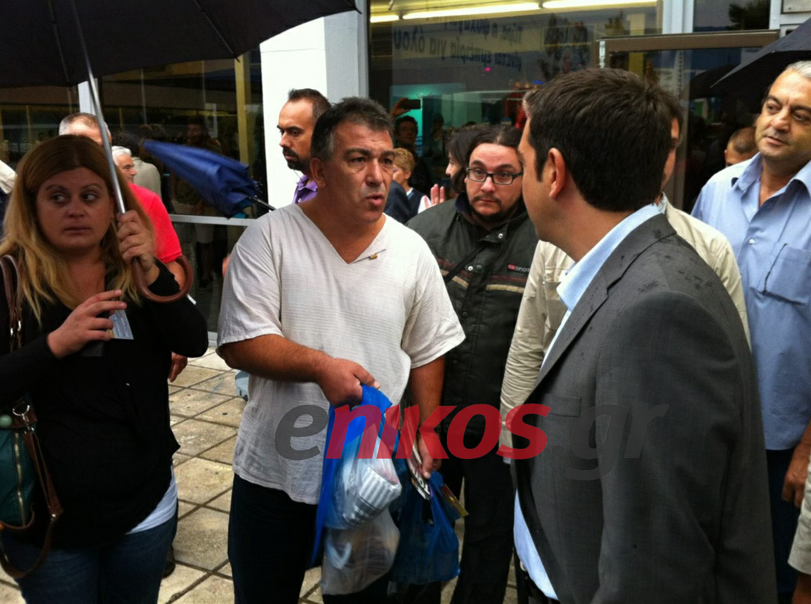Λίγο αργότερα, ο άντρας με την άσπρη μπλούζα που βλέπετε στη φωτογραφία, ο οποίος κρατούσε μια μπλε πλαστική σακούλα, επιχείρησε με γρήγορες κινήσεις να πλησιάσει τον Αλέξη Τσίπρα. Οι κινήσεις φάνηκαν ύποπτες στους αστυνομικούς που συνοδεύουν τον πρόεδρο του ΣΥΡΙΖΑ και τον πλησίασαν. «Μην ανησυχείτε μαζί του είμαι» τους είπε και ο Αλέξης Τσίπρας ρώτησε τι θέλει: «θέλω να σου πω πρόεδρε ότι σε στηρίζω», και το «επεισόδιο» έληξε εκεί.