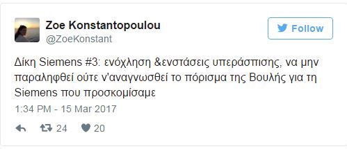 Το Τριμελές Εφετείο Κακουργημάτων απέρριψε το αίτημα γιαπαράσταση πολιτικής αγωγής που υπέβαλε η Ζωή Κωνσταντοπουλου, εκπρόσωπο του υπό σύσταση Σωματείου «Δικαιοσύνη για όλους»Η κ. Κωνσταντοπούλου, σχολίασε την απόφαση να αποβληθεί από τη δίκη της Siemens μέσω του λογαριασμού της στο Twitter.«Το Δικαστήριο μας δικαίωσε, αποβάλλοντάς μας απ’ τη στημένη δίκη. Χαλούσαμε την ωραία ατμόσφαιρα και ήμασταν “εκτός προγράμματος”», έγραψε χαρακτηριστικά.
