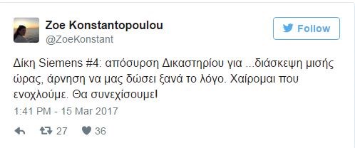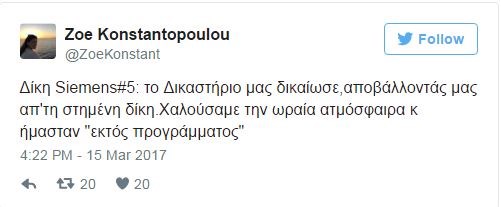 «Δίκη Siemens: απόσυρση Δικαστηρίου για …διάσκεψη μισής ώρας, άρνηση να μας δώσει ξανά το λόγο. Χαίρομαι που ενοχλούμε. Θα συνεχίσουμε!».
