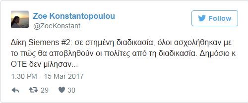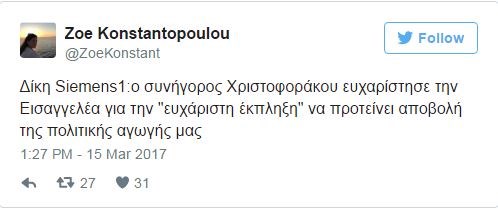 Νωρίτερα, σε μια σειρά από άλλες αναρτήσεις για την ίδια δίκη, ανέφερε:«Δίκη Siemens: ο συνήγορος Χριστοφοράκου ευχαρίστησε την Εισαγγελέα για την “ευχάριστη έκπληξη” να προτείνει αποβολή της πολιτικής αγωγής μας».