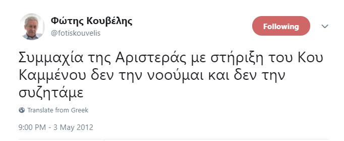 Ο νέος αναπληρωτής υπουργός Εθνικής Αμυνας, Φώτης Κουβέλης, για το ενδεχόμενο συνεργασίας με τον νυν Υπουργό Εθνικής Άμυνας, Πάνο Καμμένο, έγραφε το 2012 στο Twitter: «Συμμαχία της Αριστεράς με στήριξη του κ. Καμμένου δεν την νοούμαι και δεν την συζητάμε»