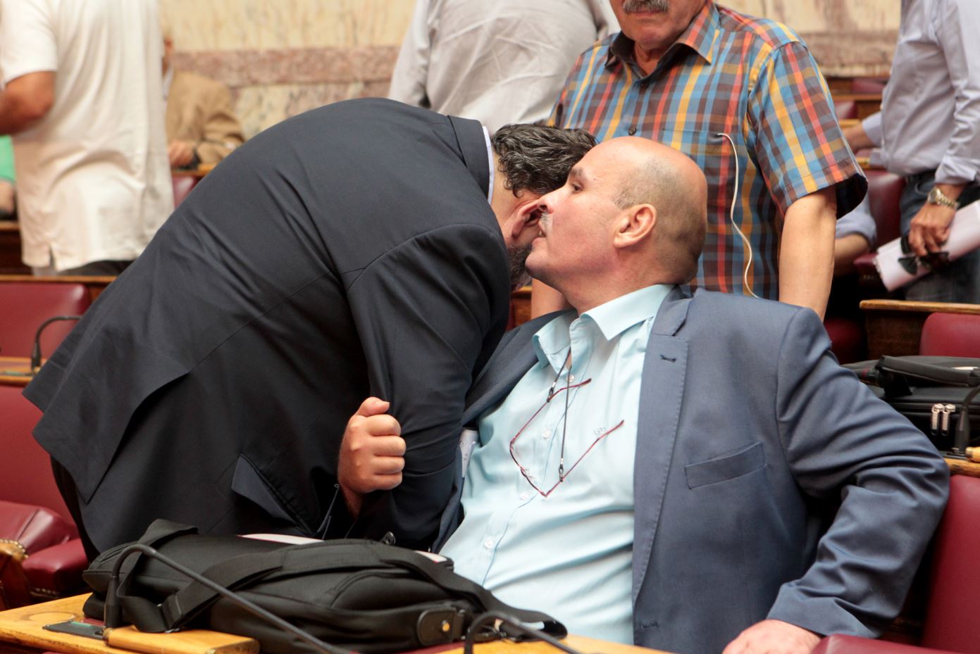 Ο φωτογραφικός φακός συνέλαβε τον βουλευτή του ΣΥΡΙΖΑ Γιάννη Μιχελογιαννάκη να συνομιλεί με τον βουλευτή του ΠΑΣΟΚ Βασίλη Κεγκέρογλου.