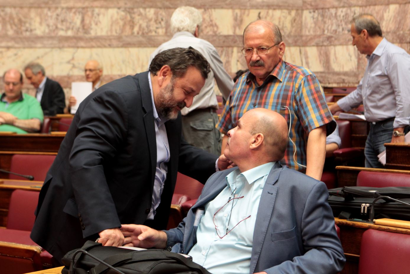 Ο φωτογραφικός φακός συνέλαβε τον βουλευτή του ΣΥΡΙΖΑ Γιάννη Μιχελογιαννάκη να συνομιλεί με τον βουλευτή του ΠΑΣΟΚ Βασίλη Κεγκέρογλου.