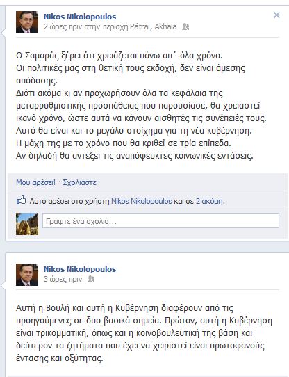 “Ο Σαμαράς ξέρει ότι χρειάζεται πάνω απ΄ όλα χρόνο. Οι πολιτικές μας στη θετική τους εκδοχή, δεν είναι άμεσης απόδοσης. Διότι ακόμα κι αν προχωρήσουν όλα τα κεφάλαια της μεταρρυθμιστικής προσπάθειας που παρουσίασε, θα χρειαστεί ικανό χρόνο, ώστε αυτά να κάνουν αισθητές τις συνέπειές τους”, έγραφε ο Νίκος Νικολόπουλος λίγες ώρες πριν υποβάλλει την παραίτησή του από τη θέση του υφυπουργού Εργασίας.