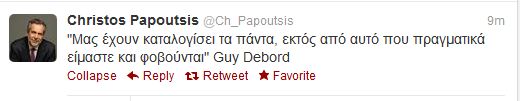 Μία φράση του Γάλλου θεωρητικού του Μαρξισμού και συγγραφέα Guy Debord έγραψε πριν από λίγο ο πρώην υπουργός και πρώην βουλευτής του ΠΑΣΟΚ Χρήστος Παπουτσής στο Twitter.