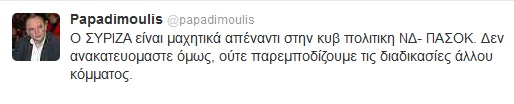 Απάντηση στην ανακοίνωση του Ανδρέα Λοβέρδου, ο οποίος κατηγορεί το ΣΥΡΙΖΑ για τη μεθόδευση διαμαρτυρίας κατά την πολιτική του εκδήλωση στην Αγία Παρασκευή, την περασμένη Τρίτη, μετά και το δημοσίευμα της εφημερίδας “Τα Νέα”, δίνει ο βουλευτής του ΣΥΡΙΖΑ, Δημήτρης Παπαδημούλης μέσω Twitter.