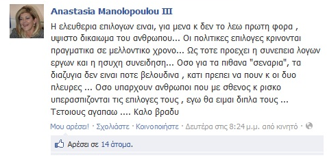 Η Αναστασία Μανωλοπούλου, σύζυγος του βουλευτή Νίκου Νικολόπουλου και δημοτική σύμβουλων Πατρών, ανήρτησε στην προσωπική της σελίδα στο Facebook σχόλιο αναφορικά με την παραίτησή του.«Η ελευθερία επιλογών είναι, για μένα και δεν το λέω πρώτη φορά, ύψιστο δικαίωμα του ανθρώπου… Οι πολιτικές επιλογές κρίνονται πραγματικά σε μελλοντικό χρόνο… Ως τότε προέχει η συνέπεια λόγων έργων και η ήσυχη συνείδηση…Όσο για τα πιθανά “σενάρια”, τα διαζύγια δεν είναι ποτέ βελούδινα, κάτι πρέπει να πουν κ οι δυο πλευρές … Όσο υπάρχουν άνθρωποι που με σθένος και ρίσκο υπερασπίζονται τις επιλογές τους, εγώ θα είμαι δίπλα τους … Τέτοιους αγαπάω …. Καλό βράδυ» έγραψε σχετικά η κυρία Μανωλοπούλου.