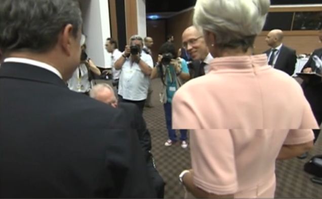 Ο Βόλφγκανγκ Σόιμπλε κάτι ψιθυρίζει στο αυτί της Κριστίν Λαγκάρντ και οι δύο τους παρέα με τον Γιέοργκ Άσμουσεν …αστειεύονται λίγο πριν ξεκινήσει, στη Λευκωσία, η κρίσιμη Σύνοδος του Eurogroup.