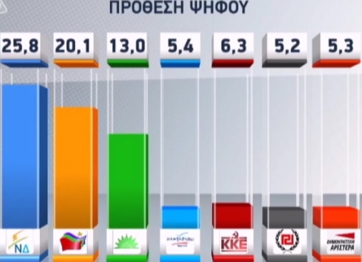 Σε δημοσκόπηση της Κάπα Research, που δημοσιεύει το Βήμα της Κυριακής, η ΝΔ στην πρόθεση ψήφου συγκεντρώνει το 25,8% έναντι 20,1% του ΣΥΡΙΖΑ και ακλουθούν το ΠΑΣΟΚ με 13%, το ΚΚΕ με 6,3%, οι Ανεξάρτητοι Έλληνες με 5,4%, η ΔΗΜΑΡ 5,3% και η Χρυσή Αυγή με 5,2%.