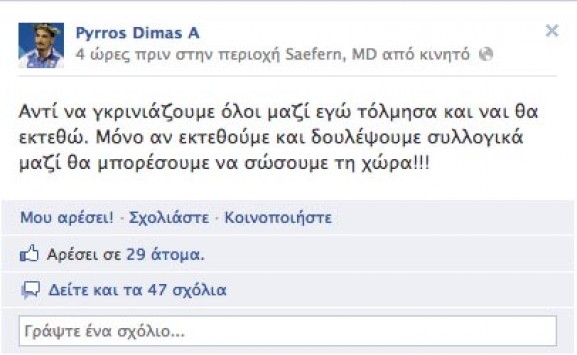 «Σήμερα με την υποψηφιότητα του Pyrros Dimas A κατάλαβα πόσο εύκολα ένας ήρωας μπορεί να ξεφτυλιστεί στα μάτια αυτων που τους έκανε περήφανους. Προλαβαίνεις να αλλάξεις απόφαση, αλλιώς κρίμα» Από την πλευρά του ο Πύρρος Δήμας απαντά: «Αντί να γκρινιάζουμε όλοι μαζί, εγώ τόλμησα και ναι θα εκτεθώ. Μόνο αν εκτεθούμε και δουλέψουμε συλλογικά μαζί θα μπορέσουμε να σώσουμε τη χώρα». Πηγή: gazzetta.gr