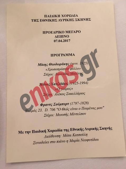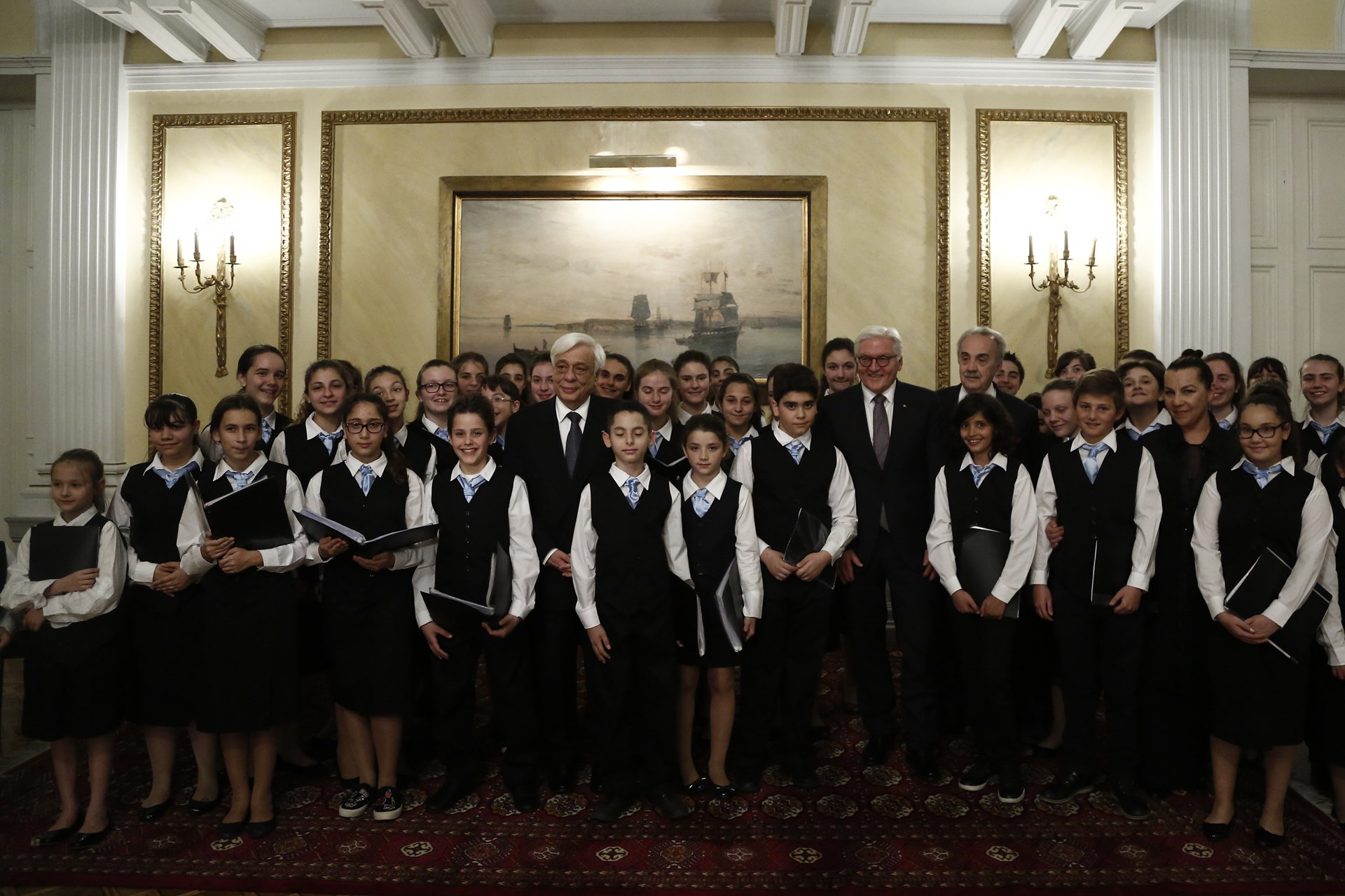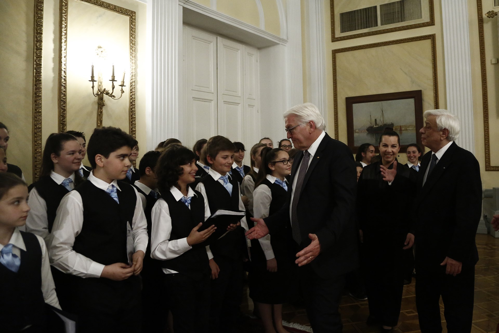 Επίσημο δείπνο προς τιμήν του Προέδρου της Γερμανικής Δημοκρατίας, Φρανκ Βάλτερ Σταϊνμάγερ παρέθεσε στο Προεδρικό Μέγαρο χθες το βράδυ, ο Πρόεδρος της Δημοκρατίας, Προκόπης Παυλόπουλος.Στην προσφώνηση του, ο κ. Παυλόπουλος συνεχάρη τον κ. Σταϊνμάγερ για την εκλογή στο ύπατο αξίωμα. Τόνισε τους ισχυρούς δεσμούς Ελλάδας – Γερμανίας, ενώ έστειλε μηνύματα στην Τουρκία ως προς το Κυπριακό, αλλά και τα ελληνικά σύνορα.Κατά τη διάρκεια του επίσημου δείπνου, ο Πρόεδρος της Δημοκρατίας και ο ομόλογός του άκουσαν τραγούδια των Μίκη Θεοδωράκη, Μάνου Χατζιδάκι και Φραντς Σούμπερτ, από την παιδική χορωδία της Εθνικής Λυρικής Σκηνής.