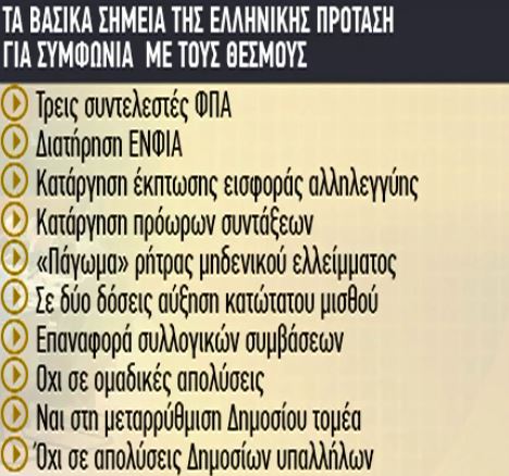Τέλος στο πεδίο των εργασιακών η ελληνική πλευρά προτείνει συλλογικές συμβάσεις, με βάση τα ευρωπαϊκά πρότυπα και σταδιακή αύξηση του κατώτατου μισθού.