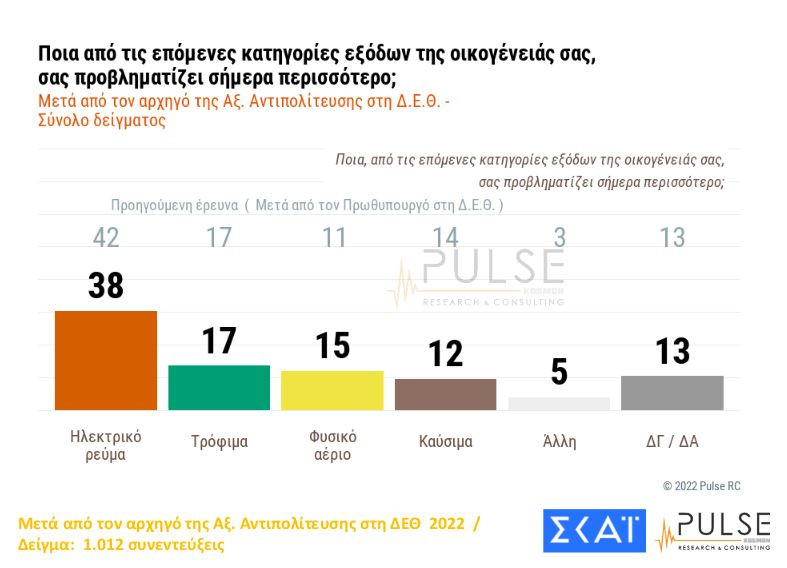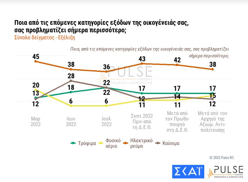 Το μέγεθος του προβληματισμού των Ελλήνων για την ακρίβεια και το κόστος ζωής, φαίνεται στις απαντήσεις των ερωτώμενων, κυρίως για τα ενεργειακά ζητήματα, με κορυφαίο το ηλεκτρικό ρεύμα. Ωστόσο και οι τιμές στα σούπερ μάρκετ, απασχολούν σε πολύ μεγάλο βαθμό, με δεδομένο ότι το κόστος της αγοράς τροφίμων έχει αυξηθεί επίσης σε πολύ μεγάλο βαθμό.
