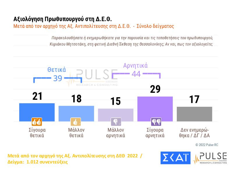 Στην ερώτηση πώς αξιολογούν οι πολίτες τις δηλώσεις του πρωθυπουργού Κυριάκου Μητσοτάκη στη ΔΕΘ, οι περισσότεροι απάντησαν αρνητικά, ενώ μόλις το 39% τις αξιολόγησε θετικά.