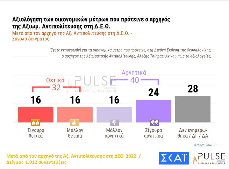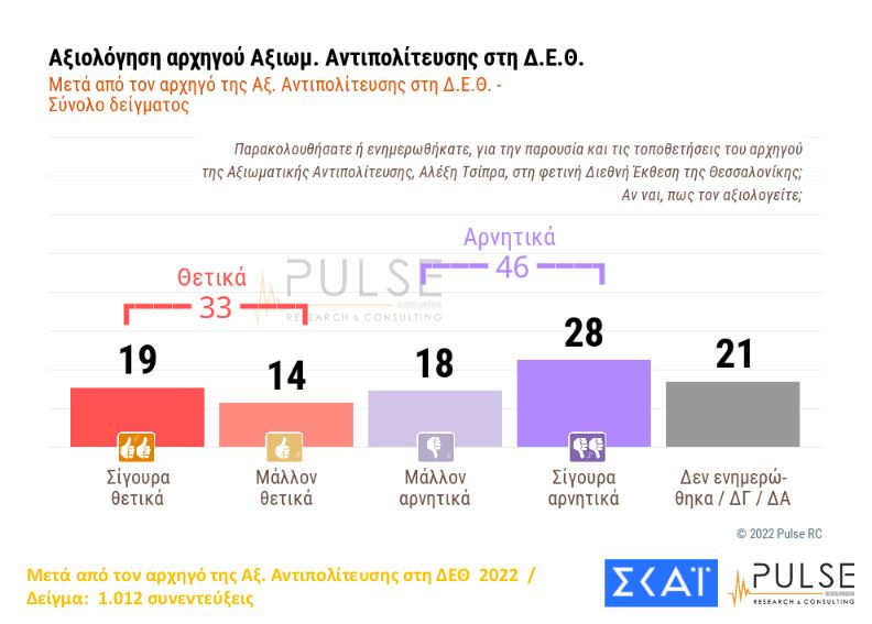 Το 46% των ερωτηθέντων αξιολόγησε επίσης αρνητικά την παρουσία του Αλέξη Τσίπρα στη ΔΕΘ. Τον πρόεδρο του ΣΥΡΙΖΑ αξιολόγησε θετικά μόλις το 33% των ερωτηθέντων.