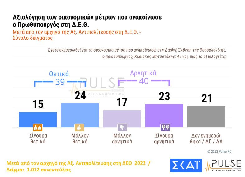Μοιρασμένα είναι πάντως τα ποσοστά αξιολόγησης για τα μέτρα που ανακοίνωσε ο πρωθυπουργός στη ΔΕΘ, προκειμένου να αντιμετωπιστούν οι συνέπειες της ενεργειακής κρίσης και η ακρίβεια.