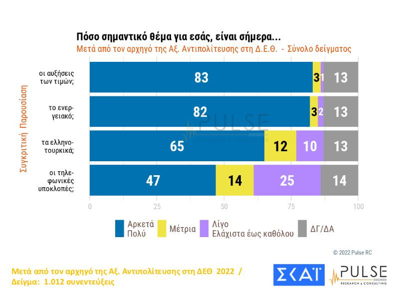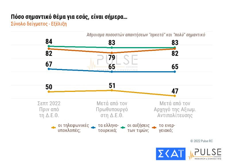 Με βάση την έρευνα αυτό που κυρίως απασχολεί τους Έλληνες είναι η ακρίβεια και το κόστος της ενέργειας, αλλά και για τα ελληνοτουρκικά. Σε μικρότερο ποσοστό, αλλά πάντως σημαντικό, απασχολούν τους Έλληνες οι υποκλοπές.