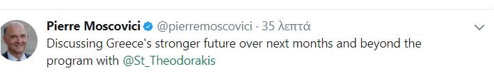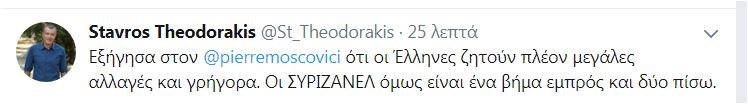 “Εξήγησα στον Πιερ Μοσκοβισί ότι οι Έλληνες ζητούν πλέον μεγάλες αλλαγές και γρήγορα. Οι ΣΥΡΙΖΑΝΕΛ όμως είναι ένα βήμα εμπρός και δύο πίσω”, έγραψε στον προσωπικό του λογαριασμό στο Twitter ο επικεφαλής του Ποταμιού.