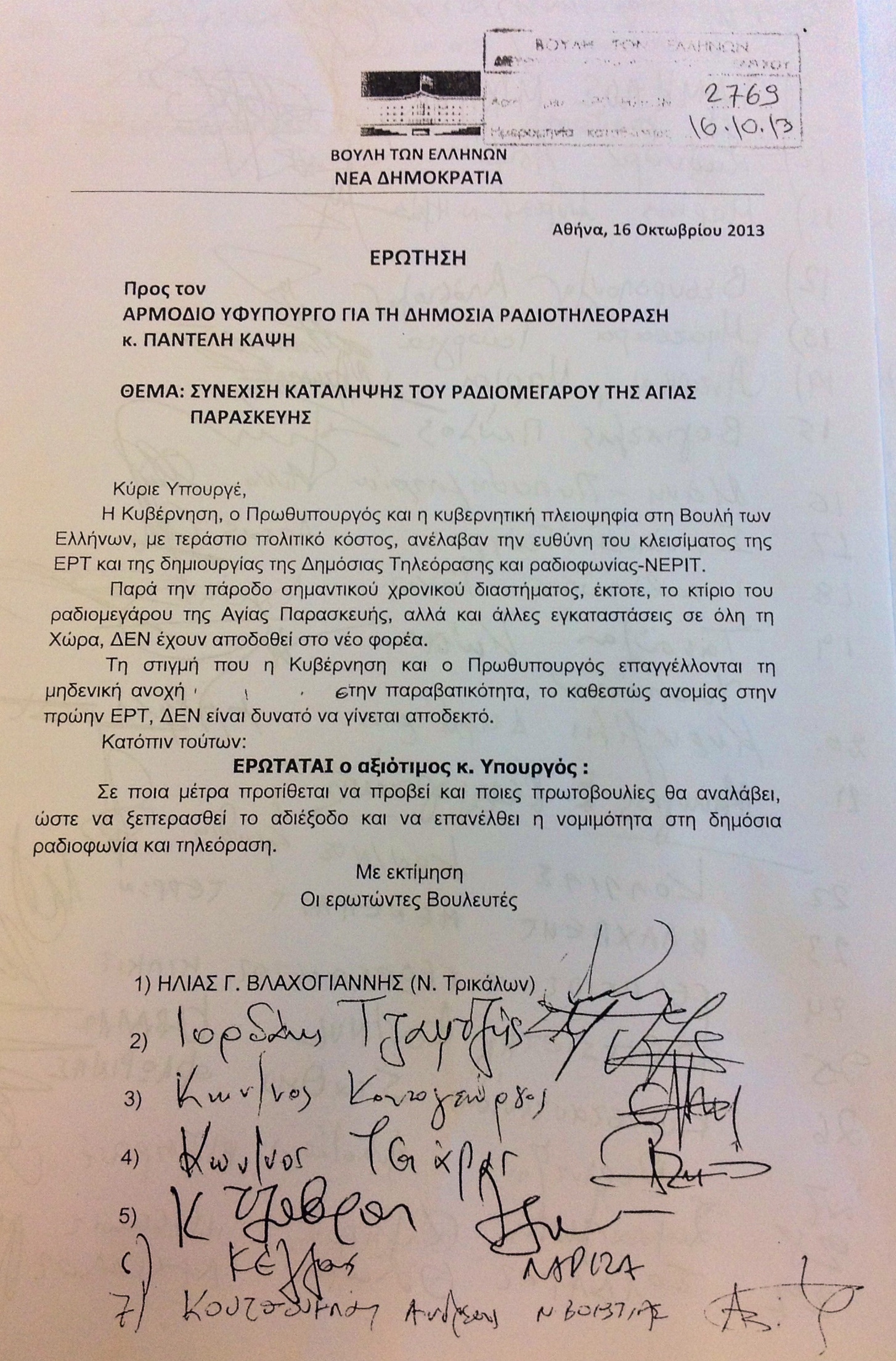 Πρώτος υπογράφει την ερώτηση ο Ηλίας Βλαχογιάννης και ακολουθούν, μεταξύ άλλων, οι Ιορδάνης Τζαμτζής, Ανδρέας Κουτσούμπας, Αναστάσιος Νεράντζης, Κωνσταντίνος Τασσούλας, Μανώλης Κεφαλογιάννης, Αναστάσιος Νεράντζης, Κωνσταντίνος Τσιάρας, Κωνσταντίνος Τζαβάρας.
