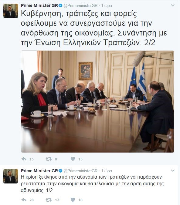 Να δώσουν ανάσα σε νοικοκυριά και επιχειρήσεις που έχουν κόκκινα δάνεια και να μην προχωρήσουν οι ίδιοι σε ομαδικές απολύσεις, ζήτησε, σύμφωνα με πληροφορίες, από τους τραπεζίτες, ο πρωθυπουργός Αλέξης Τσίπρας, κατά τη σημερινή συνάντησή του με το προεδρείο της Ελληνικής Ένωσης Τραπεζών (ΕΕΤ), στο Μέγαρο Μαξίμου.«Η κρίση ξεκίνησε από την αδυναμία των τραπεζών να παράσχουν ρευστότητα στην οικονομία και θα τελειώσει με την άρση αυτής της αδυναμίας.Κυβέρνηση, τράπεζες και φορείς οφείλουμε να συνεργαστούμε για την ανόρθωση της οικονομίας», έγραψε στο λογαριασμό του στο Τwitter, ο Πρωθυπουργός, μετά τη συνάντησή του με το Προεδρείο της Ελληνικής Ένωσης Τραπεζών.Στη συνάντηση συμμετείχαν επίσης ο Αντιπρόεδρος της Κυβέρνησης, Γιάννης Δραγασάκης και ο Υφυπουργός παρά τω Πρωθυπουργώ, Δημήτρης Λιάκος.Κατά τη συνάντηση συζητήθηκαν οι προοπτικές της ελληνικής οικονομίας, η συνεργασία κυβέρνησης και τραπεζών με στόχο τη βελτίωση της παροχής ρευστότητας στην πραγματική οικονομία και τις επιχειρήσεις, η αποτελεσματική διαχείριση των μη εξυπηρετούμενων δανείων και η περεταίρω ενίσχυση του ελληνικού τραπεζικού συστήματος.Δείτε τις αναρτήσεις: