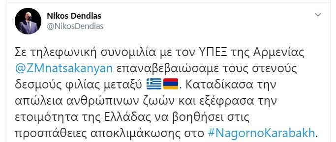 Σε ανάρτηση του υπουργείου Εξωτερικών στο twitter σημειώνεται ότι ο κ. Δένδιας καταδίκασε την απώλεια ζωών και επιβεβαιώθηκε η ετοιμότητα της Ελλάδος να βοηθήσει στις προσπάθειες για άμεση αποκλιμάκωση στο Ναγκόρνο-Καραμπάχ.