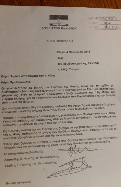 «Η κατηγορηματική απόρριψη της γενοκτονίας των Ποντίων από τον κ. Φίλη, υπουργό Παιδείας της κυβέρνησής σας, με δημόσια τοποθέτησή του σε τηλεοπτική εκπομπή προσβάλλει τη μνήμη των προγόνων μας.