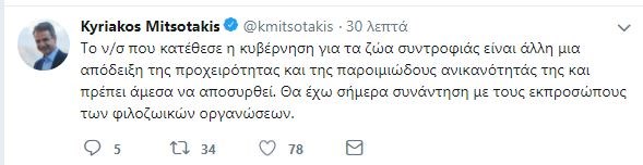 Ο πρόεδρος της Νέας Δημοκρατίας με ανάρτησή του στο Twitter αναφέρει: «Το ν/σ που κατέθεσε η κυβέρνηση για τα ζώα συντροφιάς είναι άλλη μια απόδειξη της προχειρότητας και της παροιμιώδους ανικανότητάς της και πρέπει άμεσα να αποσυρθεί. Θα έχω σήμερα συνάντηση με τους εκπροσώπους των φιλοζωικών οργανώσεων».