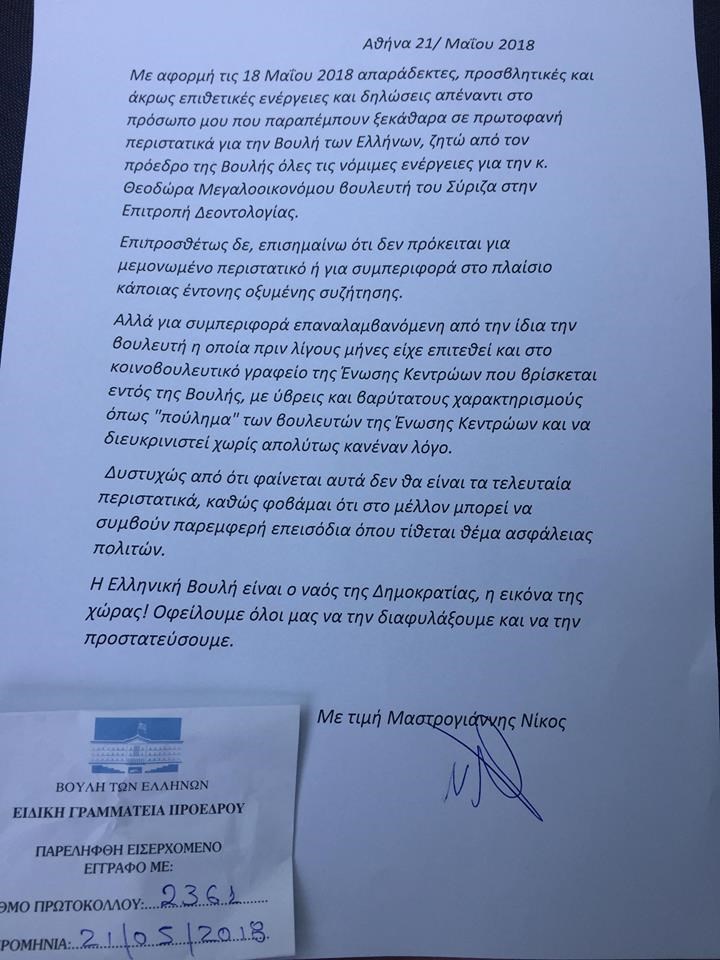 Συγκεκριμένα, η επιστολή: Με αφορμή τις 18 Μαΐου 2018 απαράδεκτες, προσβλητικές και άκρως επιθετικές ενέργειες και δηλώσεις απέναντι στο πρόσωπο μου που παραπέμπουν ξεκάθαρα σε πρωτοφανή περιστατικά για την Βουλή των Ελλήνων, ζητώ από τον πρόεδρο της Βουλής όλες τις νόμιμες ενέργειες για την κ. Θεοδώρα Μεγαλοοικονόμου βουλευτή του Σύριζα στην Επιτροπή Δεοντολογίας.
