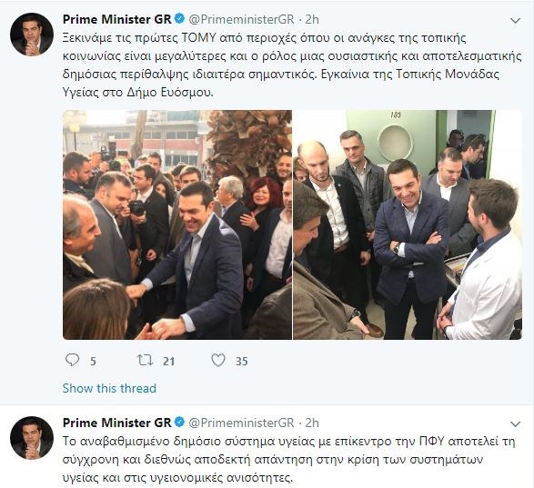 Στο λογαριασμό του εξάλλου, στο Twitter ο πρωθυπουργός προκρίνει την αναβάθμιση του δημοσίου συστήματος υγείας.«Το αναβαθμισμένο δημόσιο σύστημα υγείας με επίκεντρο την ΠΦΥ (Πρωτοβάθμια Φροντίδα Υγείας) αποτελεί τη σύγχρονη και διεθνώς αποδεκτή απάντηση στην κρίση των συστημάτων υγείας και στις υγειονομικές ανισότητες» αναφέρει στην ανάρτησή του ο πρωθυπουργός και τονίζει: «Ξεκινάμε τις πρώτες ΤΟΜΥ από περιοχές όπου οι ανάγκες της τοπικής κοινωνίας είναι μεγαλύτερες και ο ρόλος μιας ουσιαστικής και αποτελεσματικής δημόσιας περίθαλψης ιδιαίτερα σημαντικός. Εγκαίνια της Τοπικής Μονάδας Υγείας στο Δήμο Ευόσμου».
